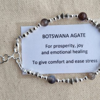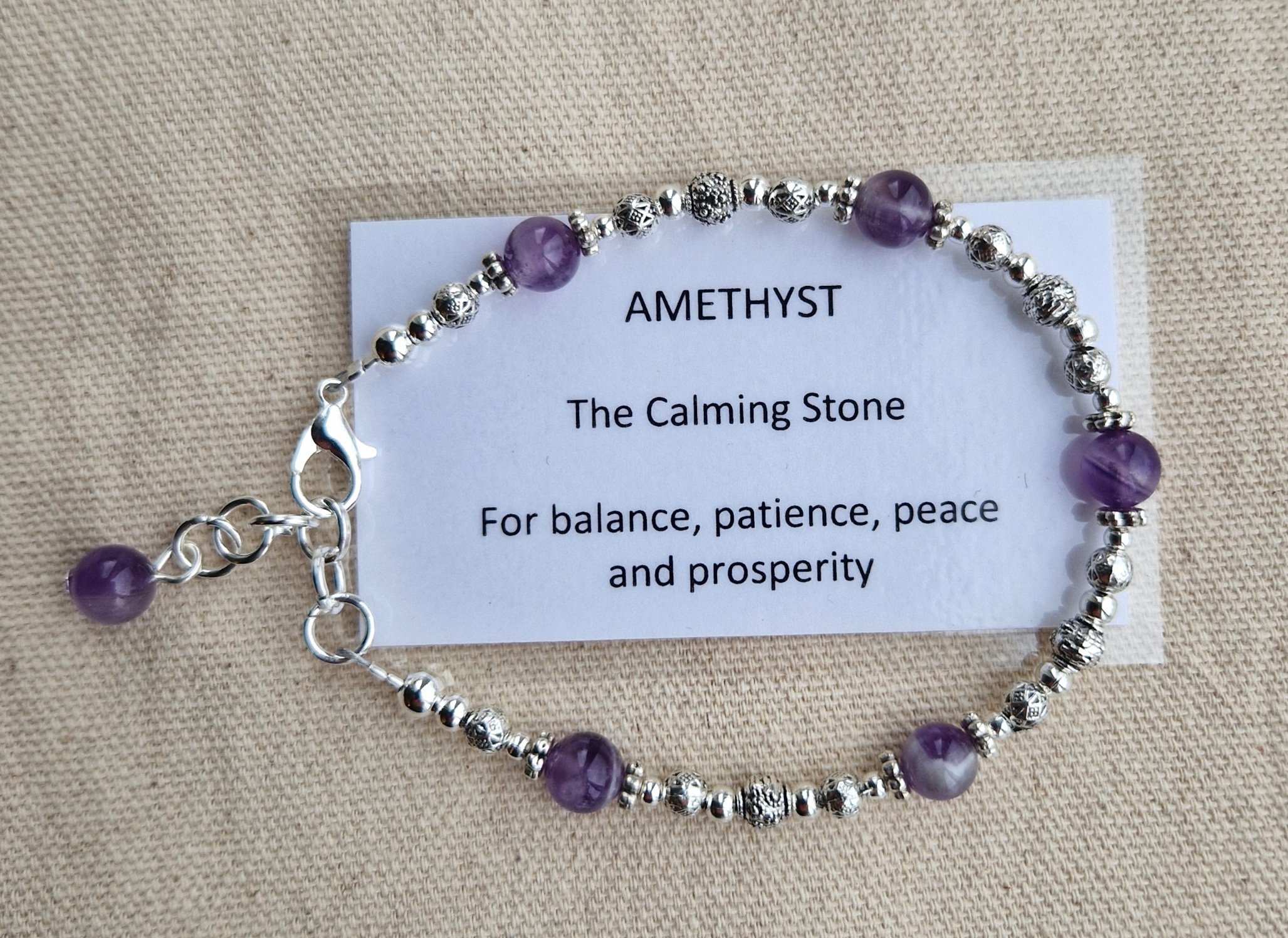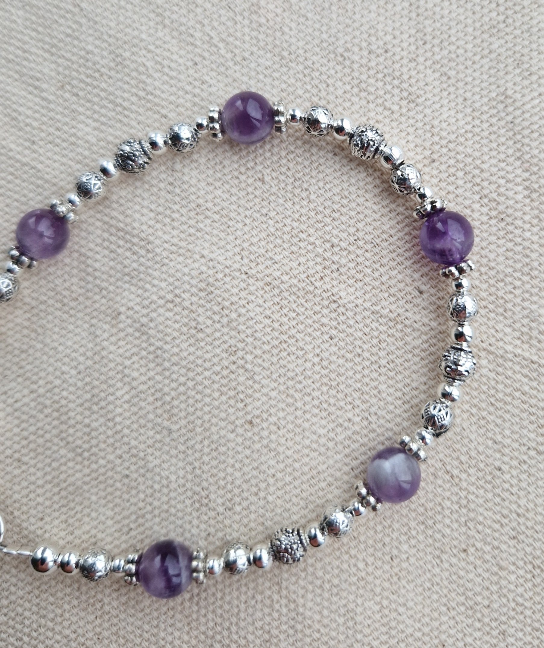 Beautiful shade of purple in these 6mm Amethyst beads. Accompanied by a pattern of Tibetan silver beads and silver plated beads.