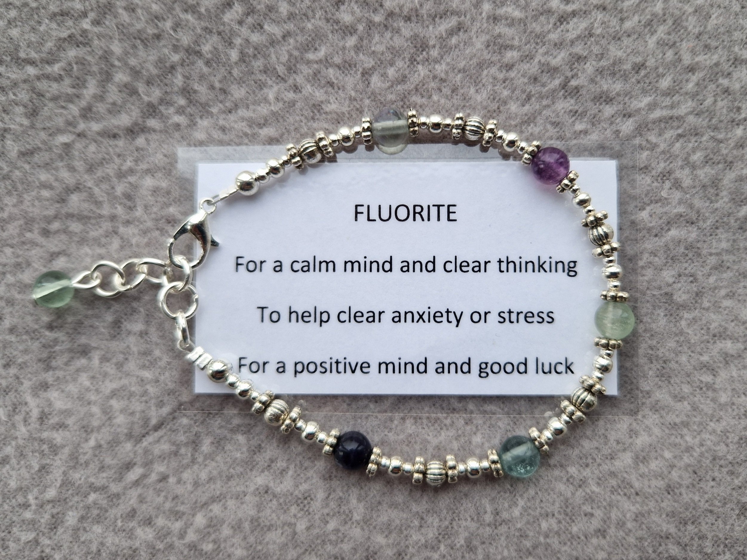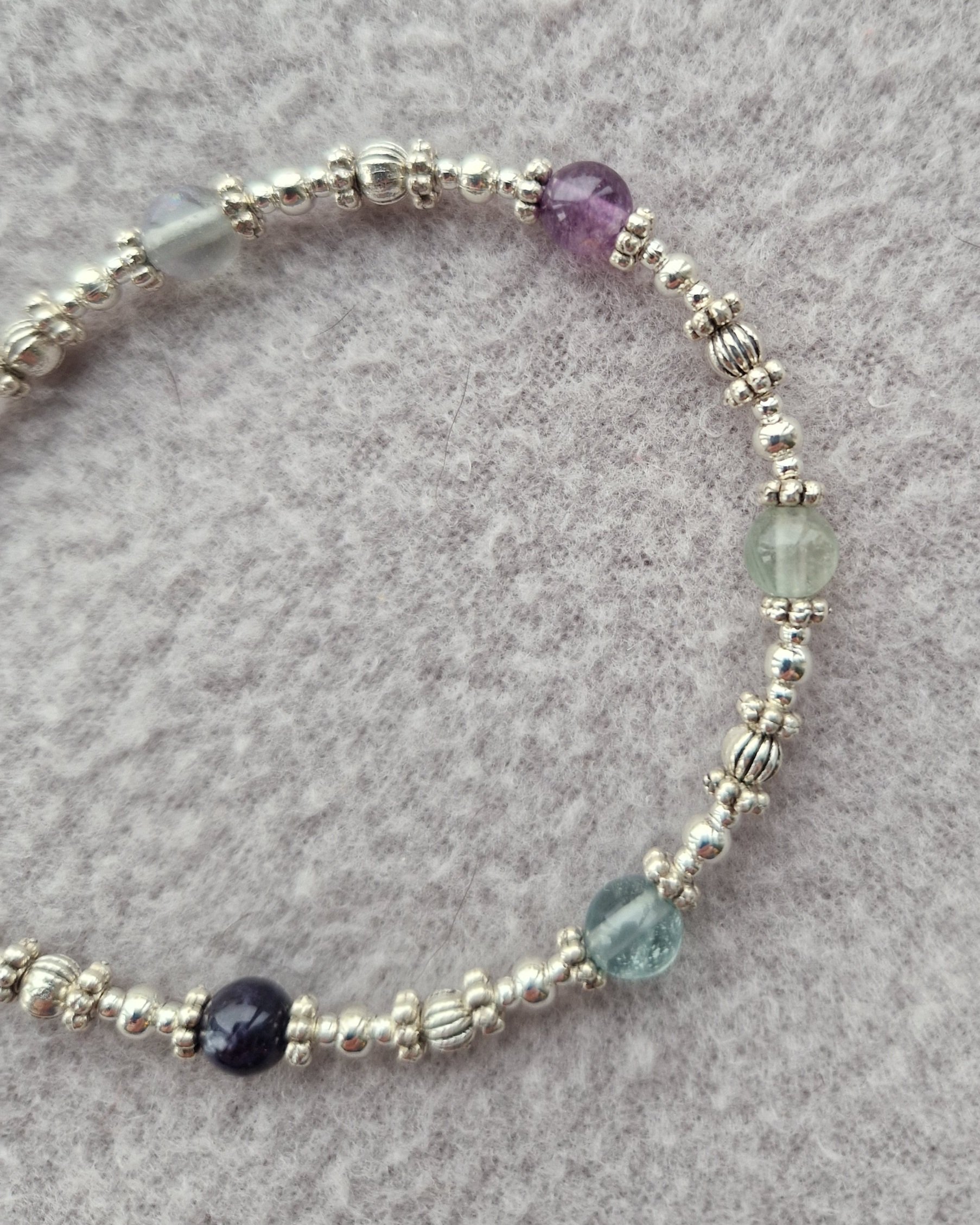 If you are looking for pretty, feminine and delicate look no further than Fluorite. The beads are in shades of green, jade, purple, lilac and clear…..it’s a very calming bracelet to look at. There are some Tibetan silver beads too.