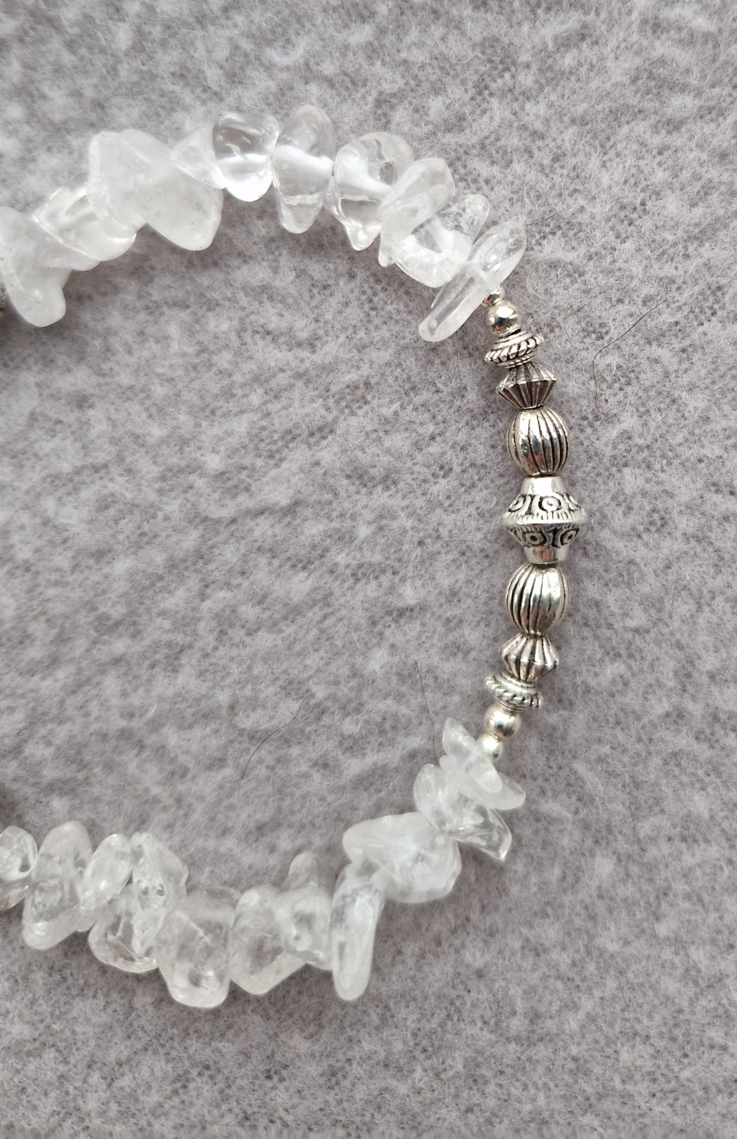 Two runs of Crystal Quartz chips for this bracelet. They are mostly clear but some have a slightly opaque look. Filling the rest of this bracelet are some Tibetan silver beads.